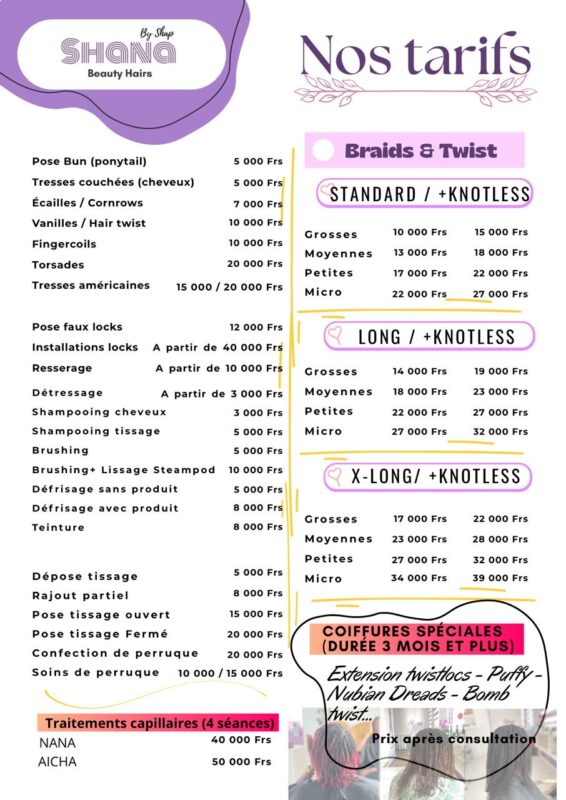 Nous offrons une vaste sélection de services capillaires pour adultes et enfants, conçus pour répondre à toutes vos envies. Que vous souhaitiez des knotless, des braids, des twists, des torsades, des tresses américaines, des tissages ouverts ou fermés, la confection ou l’entretien de perruques, des rajouts partiels, des poses chignons ou un traitement capillaire, nos spécialistes sont prêts à créer des coiffures raffinées et durables, parfaites pour mettre en valeur votre style chaque jour.